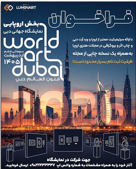 امسال هم فرصت حضور در بزرگترین رویداد هنری خاورمیانه رو دارید. مؤسسه فرهنگی–هنری وزین نقش مینا با افتخار از هنرمندان واجد شرایط برای حضور در بخش اروپایی نمایشگاه جهانی هنر دبی دعوت به عمل میآورد. این رویداد یکی از معتبرترین بسترهای ارائه آثار هنری در سطح بینالمللی محسوب میشود و فرصت ارزشمندی برای معرفی حرفهای هنرمندان، توسعه رزومه جهانی و برقراری ارتباط با مجموعهداران، گالریها و پلتفرمهای هنری بینالمللی فراهم میسازد.