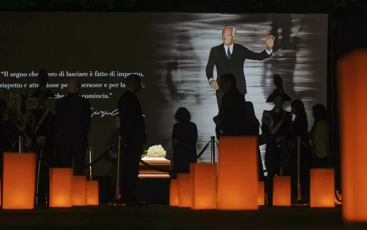 تصاویر غرفهٔ سالن تئاتر آرمانی در میلان نشان میدهد که مراسم تشییع با فضایی آرام و مملو از احترام آغاز شد. در ورودی سالن، دستههای گل و شمعها گویی یادآور دوران پر از خلاقیت وی بود. گارد افتخار کارابینری در دو سوی تابوت با حضور جمعی از هنرمندان و شخصیتهای معتبر، از جمله نامآشنایان دنیای مد و فرهنگ، حاضر بودند.