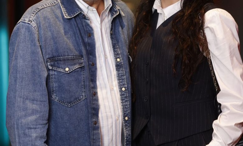 جلیقه و شلوار راه‌راه؛ تیپ متفاوت مونا فرجاد در کنار پدرش جلیل فرجاد