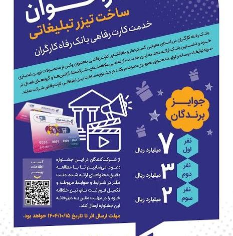 بانک رفاه کارگران با فراخوان داغ، همه علاقهمندان، شرکتها، آژانسها و غولهای تبلیغات و تولید محتوای تصویری را به جشنواره تیزر کارت رفاهی دعوت کرد؛ این فرصت طلایی برای خلق تیزرهای خلاقانه در انتظار شماست!لینک مستقیم و جوایز نجومی علاقهمندان سریع به https://www.refah-bank.ir/cardRefahiClip سر بزنند و تیزرهای تبلیغاتی کارت رفاهی را آپلود کنند؛ هیئت داوران نخبه تبلیغات، برندگان را انتخاب کرده و جوایز نقدی ۷، ۳ و ۲ میلیارد ریالی را به نفرات اول تا سوم میبخشد.این جشنواره، صحنهای برای درخشش ایدههای نو و معرفی کارت رفاهی به عموم است؛ بانک رفاه با این حرکت، خلاقیت رسانهای را به چالش کشیده و منتظر موج مشارکت است.